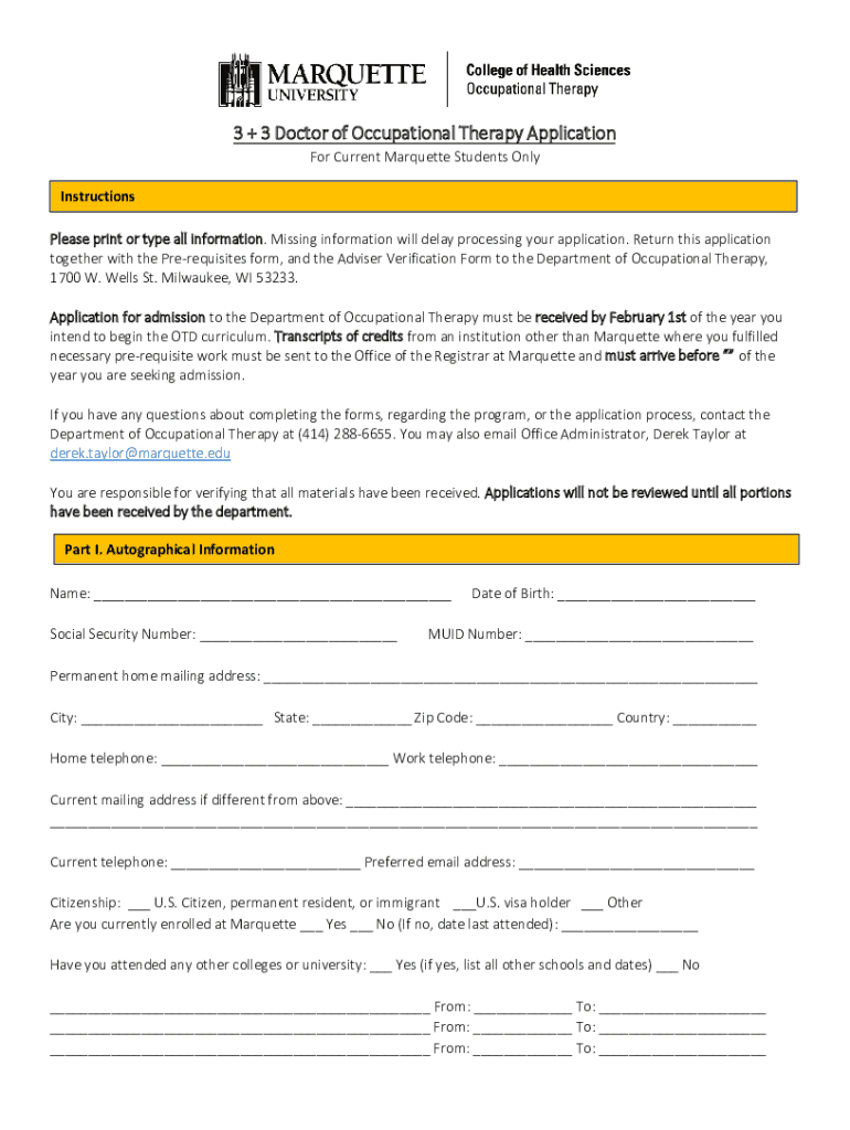3 + 3 Doctor of Occupational Therapy Application For Current Marquette Students Only Instructions Please print or type all information. Missing information will delay processing your application.