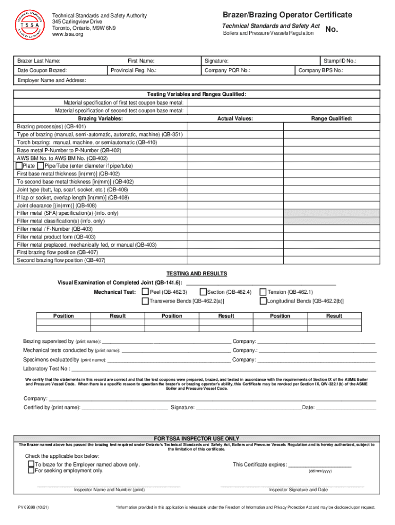 Brazer/Brazing Operator CertificateTechnical Standards and Safety Authority 345 Carlingview Drive Toronto, Ontario, M9W 6N9 www.tssa.orgBrazer Last Name:Technical Standards and Safety Act Boilers