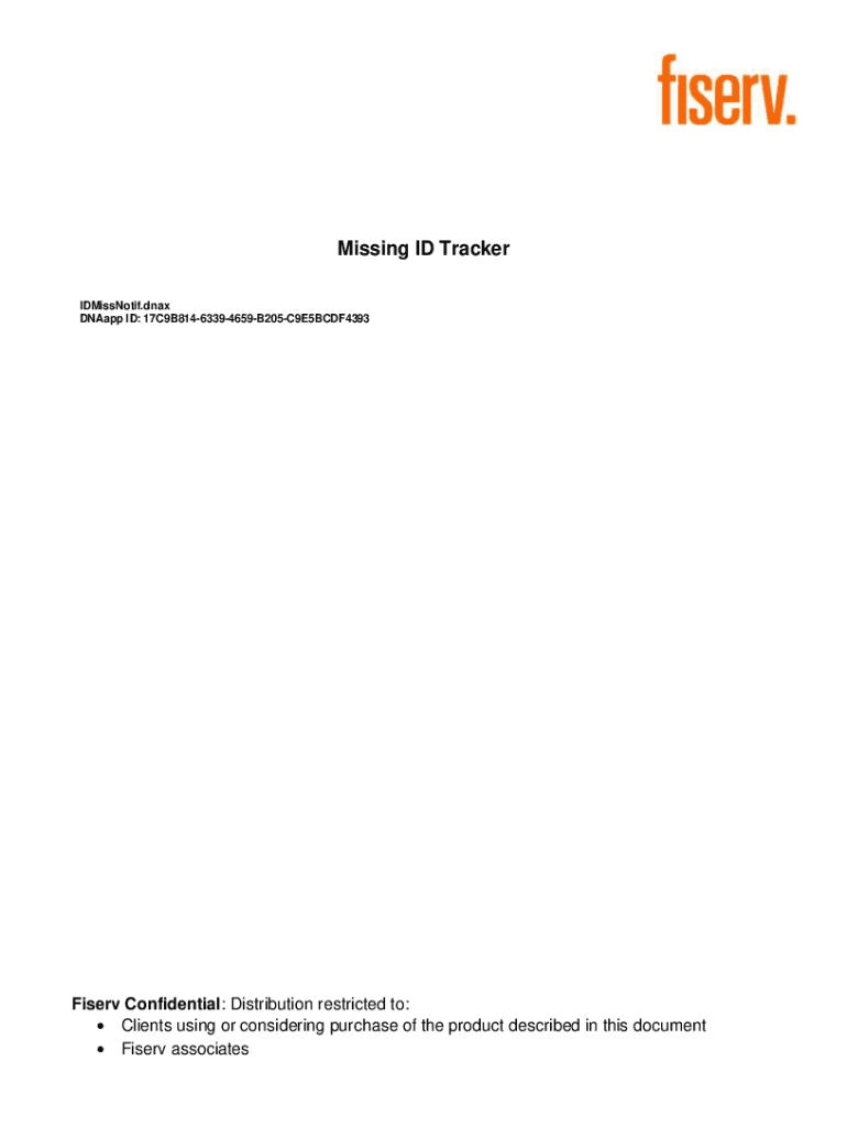 IDMissNotif. DNA app ID: 17C9B81463394659B205C9E5BCDF4393Fiserv Confidential: Distribution restricted to: