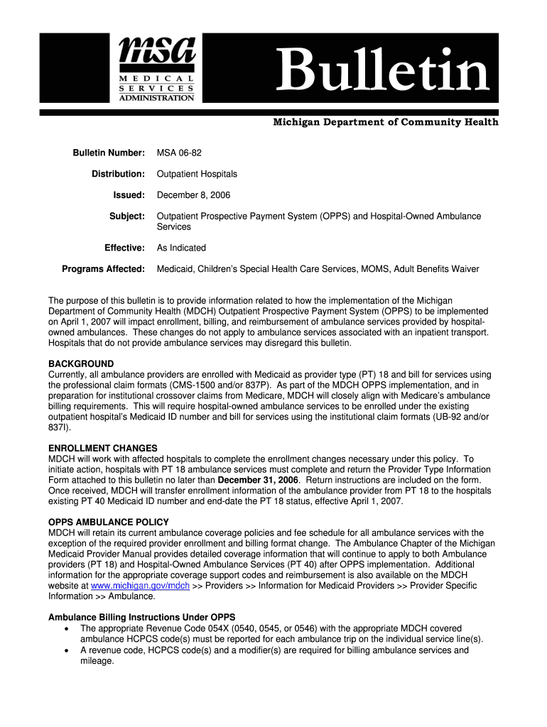 Bulletin Michigan Department of Community Health Bulletin Number: Distribution: Issued: Subject: Effective: Programs Affected: MSA 06-82 Outpatient Hospitals December 8, 2006, Outpatient Prospective