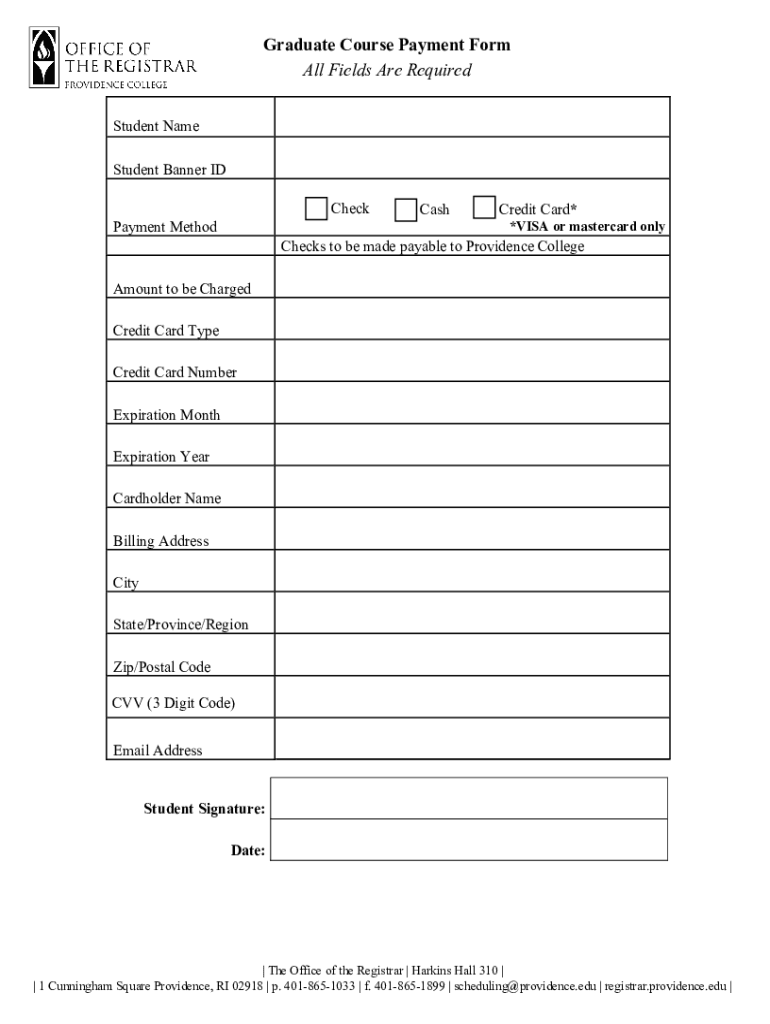 Graduate Course Payment Form All Fields Are Required Student Name Student Banner ID CheckPayment MethodCashCredit Card**VISA or MasterCard paychecks to be made payable to Providence CollegeAmount