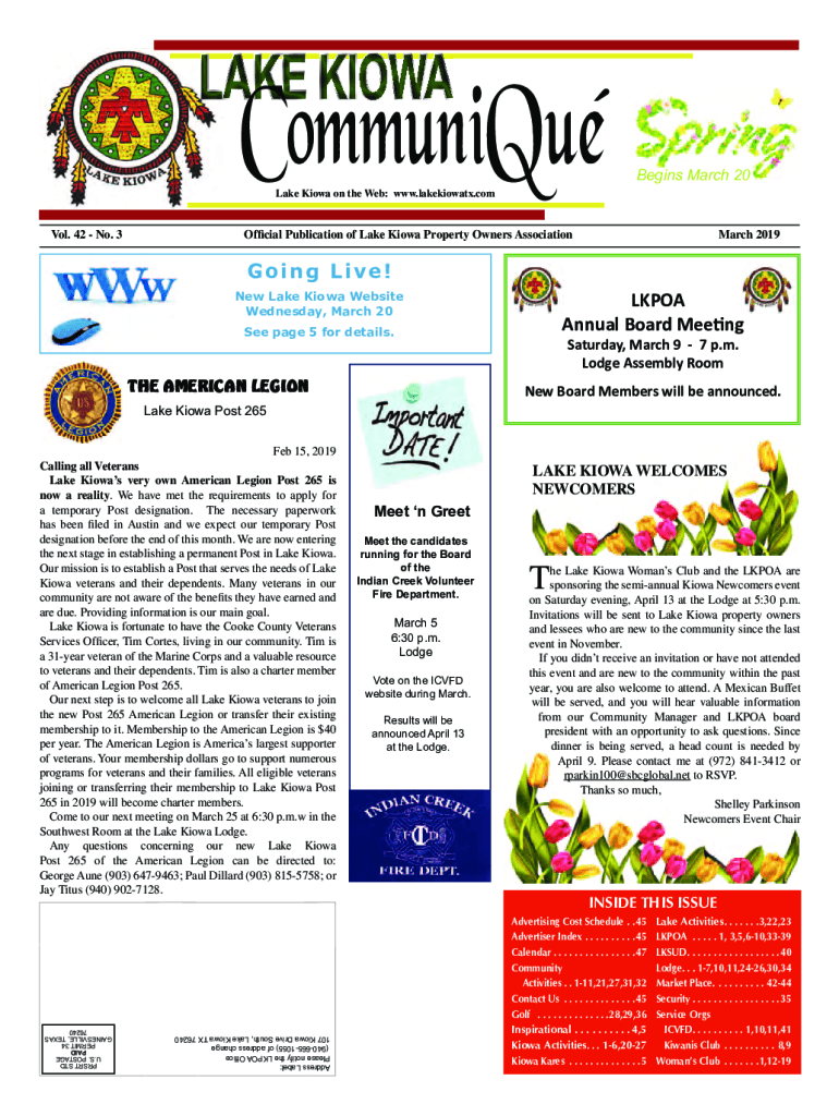 LAKE KIOWACommuniQueBegins March 20Lake Kiowa on the Web: www.lakekiowatx.comVol. 42 No. 3Official Publication of Lake Kiowa Property Owners Association March 2019Going Live!