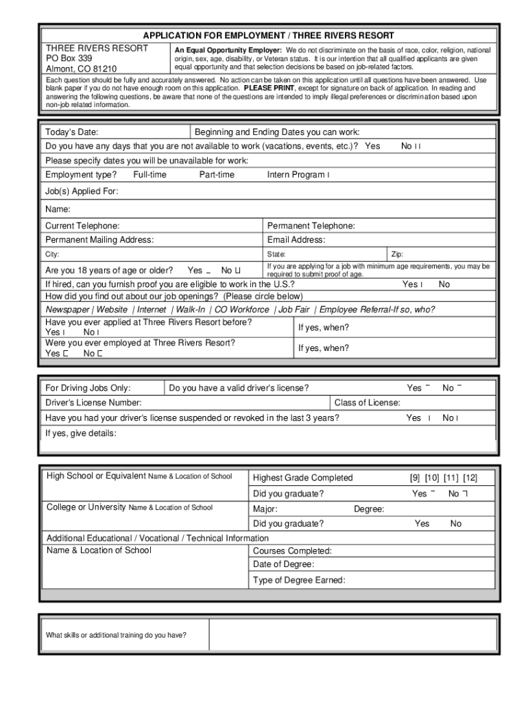 APPLICATION FOR EMPLOYMENT / THREE RIVERS RESORT THREE RIVERS RESORT An Equal Opportunity Employer: We do not discriminate on the basis of race, color, religion, national origin, sex, age, disability,