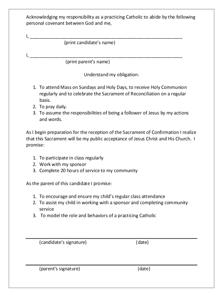 Acknowledging my responsibility as a practicing Catholic to abide by the following personal covenant between God and me, I, ___ (print candidates name) I, ___ (print parents name) Understand my obligation: