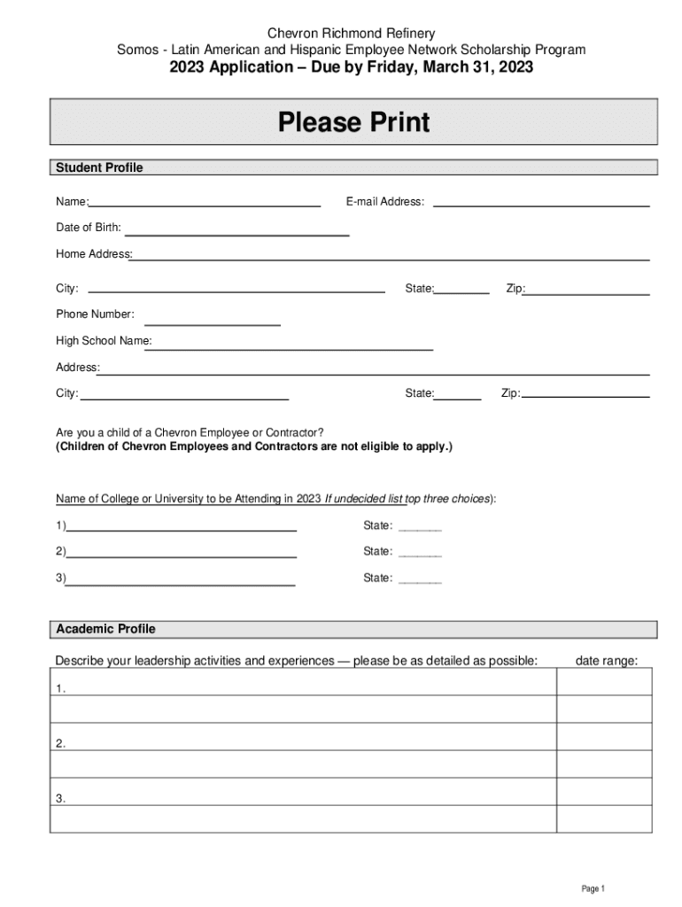 Chevron Richmond Refinery Solos Latin American and Hispanic Employee Network Scholarship Program2023 Application Due by Friday, March 31, 2023Please Print Student Profile Name:Email Address:Date of