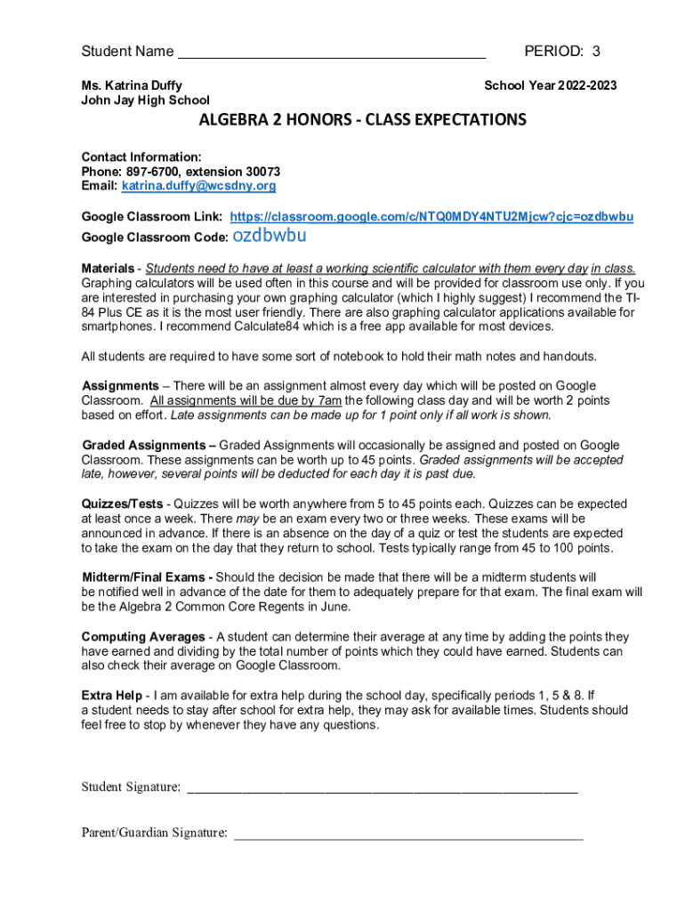 Student Name ___ Ms. Katrina Duffy John Jay High SchoolPERIOD: 3School Year 20222023ALGEBRA 2 HONORS CLASS EXPECTATIONS Contact Information: Phone: 8976700, extension 30073 Email: katrina.duffy@wcsdny.org
