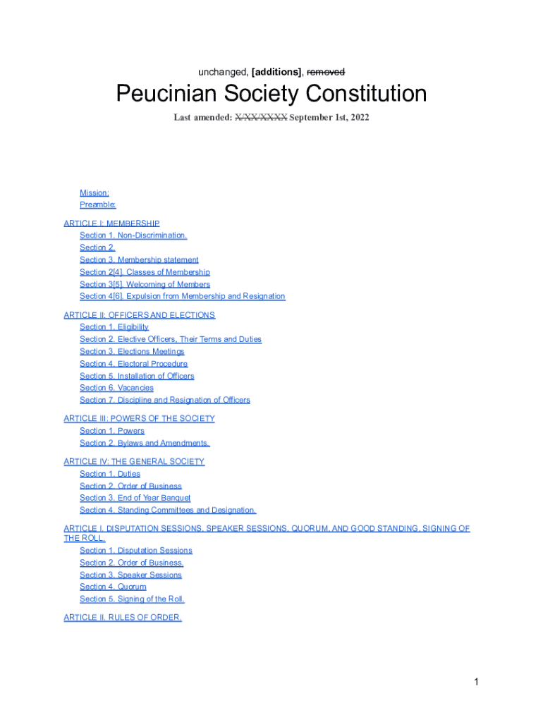 Unchanged, [additions], removedPeucinian Society Constitution Last amended: X/XX/XXX September 1st, 2022Mission: Preamble: ARTICLE I: MEMBERSHIP Section 1. Nondiscrimination. Section 2. Section 3.