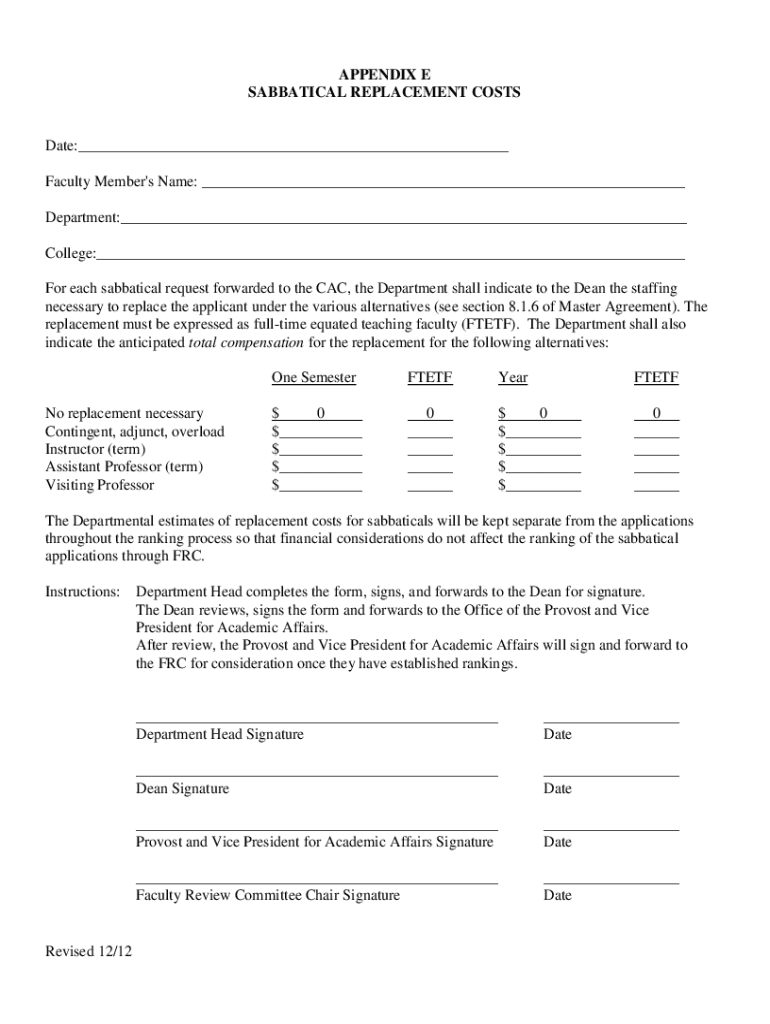 APPENDIX E SABBATICAL REPLACEMENT Postdate:___ Faculty Member\'s Name: ___ Department:___ College:___ For each sabbatical request forwarded to the CAC, the Department shall indicate to the Dean the