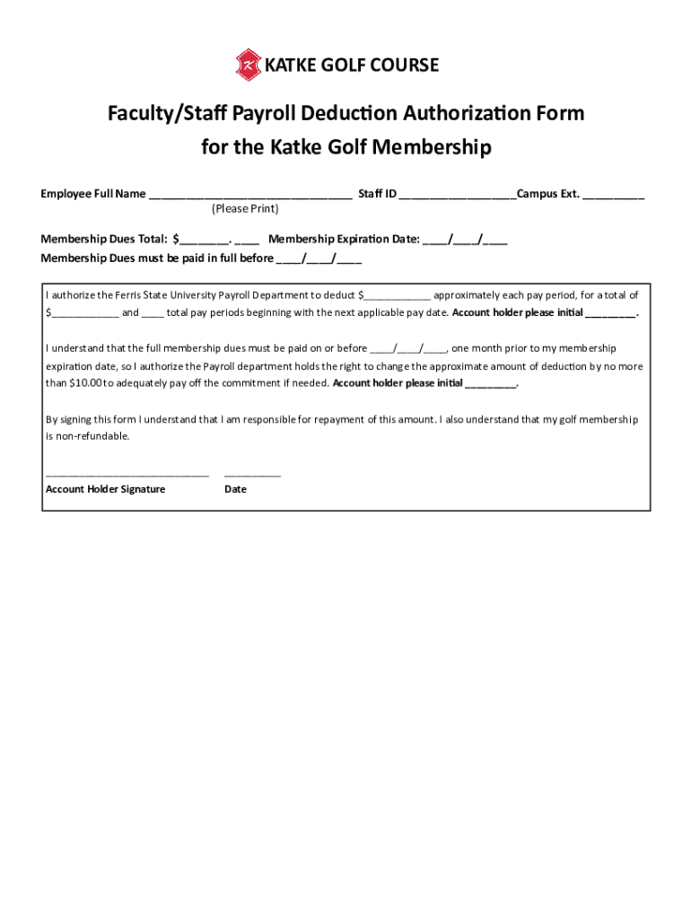 KATE GOLF COURSEFaculty/Staff Payroll Deduction Authorization Form for the Kate Golf Membership Employee Full Name ___ Staff ID ___Campus Ext. ___ (Please Print) Membership Dues Total: $___. ___ Membership
