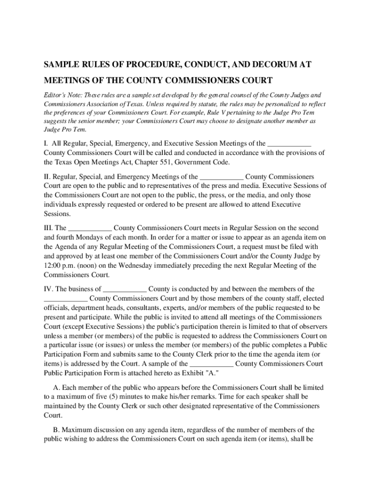 SAMPLE RULES OF PROCEDURE, CONDUCT, AND DECORUM AT MEETINGS OF THE COUNTY COMMISSIONERS COURT Editors Note: These rules are a sample set developed by the general counsel of the County Judges and Commissioners