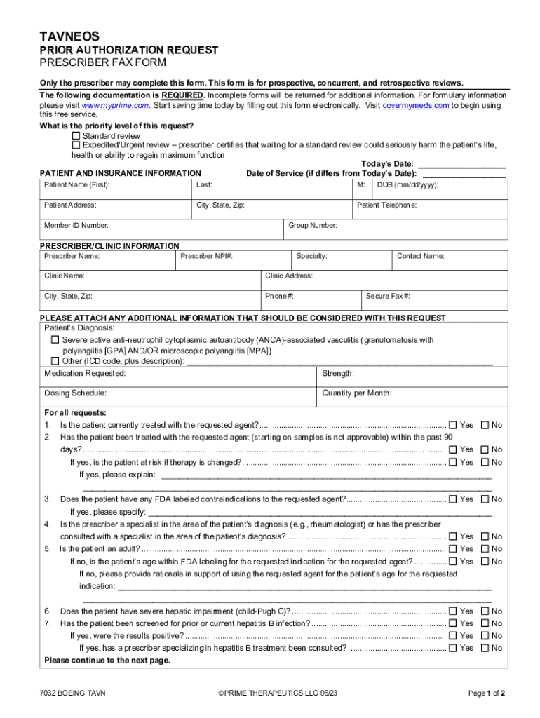 TAVNEOSPRIOR AUTHORIZATION REQUEST PRESCRIBER FAX FORM Only the prescriber may complete this form. This form is for prospective, concurrent, and retrospective reviews. The following documentation