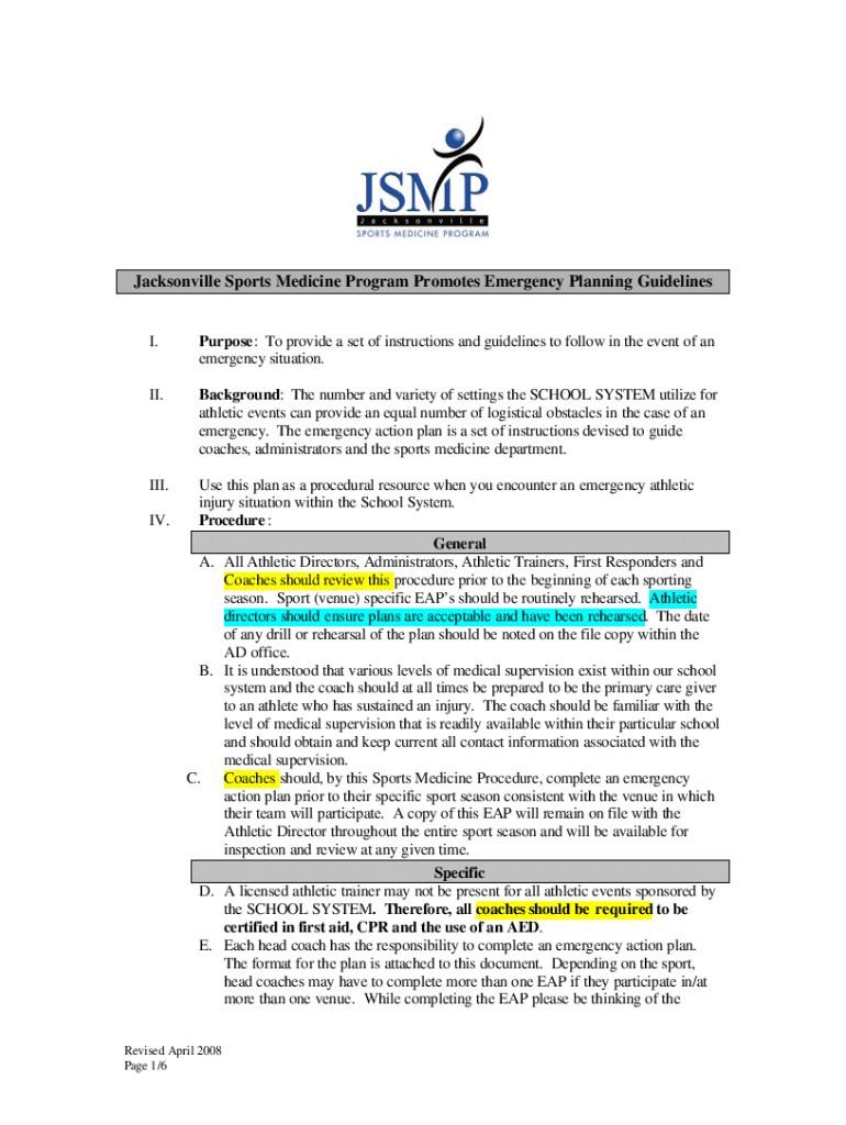 Jacksonville Sports Medicine Program Promotes Emergency Planning Guidelines. Purpose: To provide a set of instructions and guidelines to follow in the event of an emergency situation.II. Background: