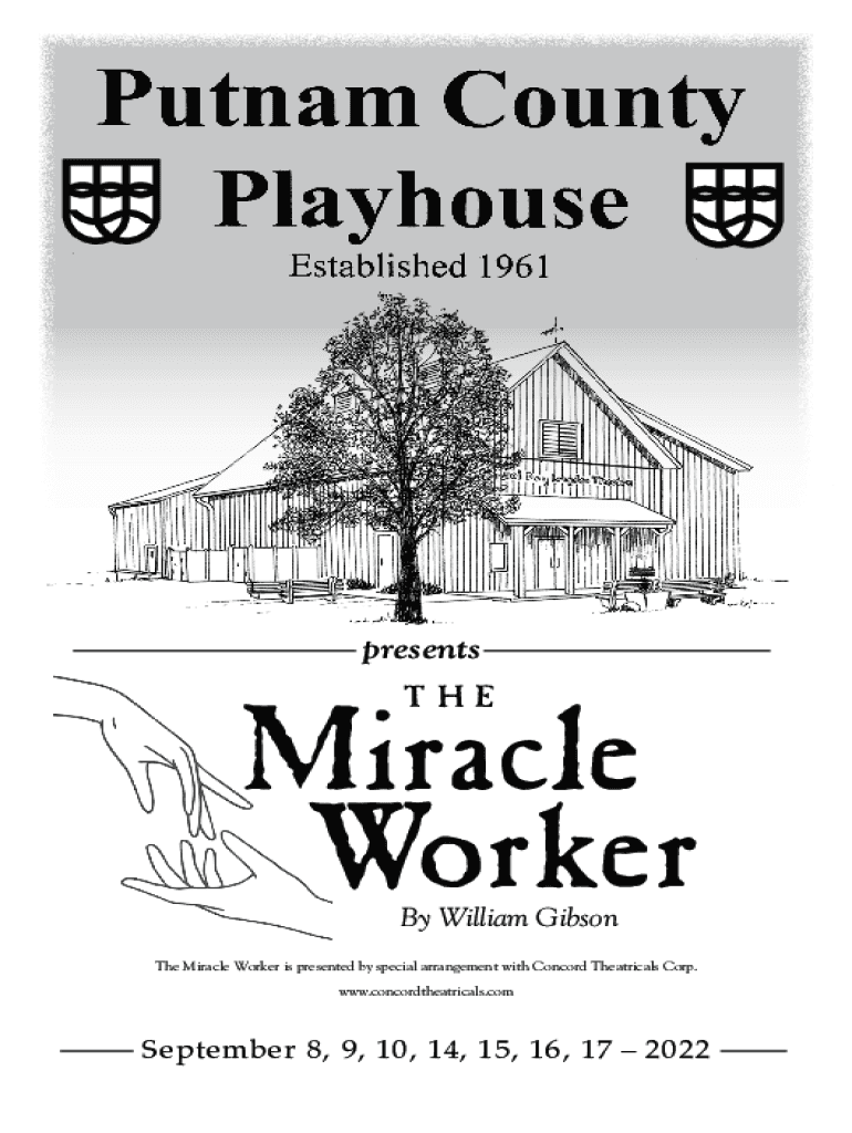 PresentsMiracle Worker They William Gibson Miracle Worker is presented by special arrangement with Concord Theatricals Corp. www.concordtheatricals.comSeptember 8, 9, 10, 14, 15, 16, 17 2022The Cast