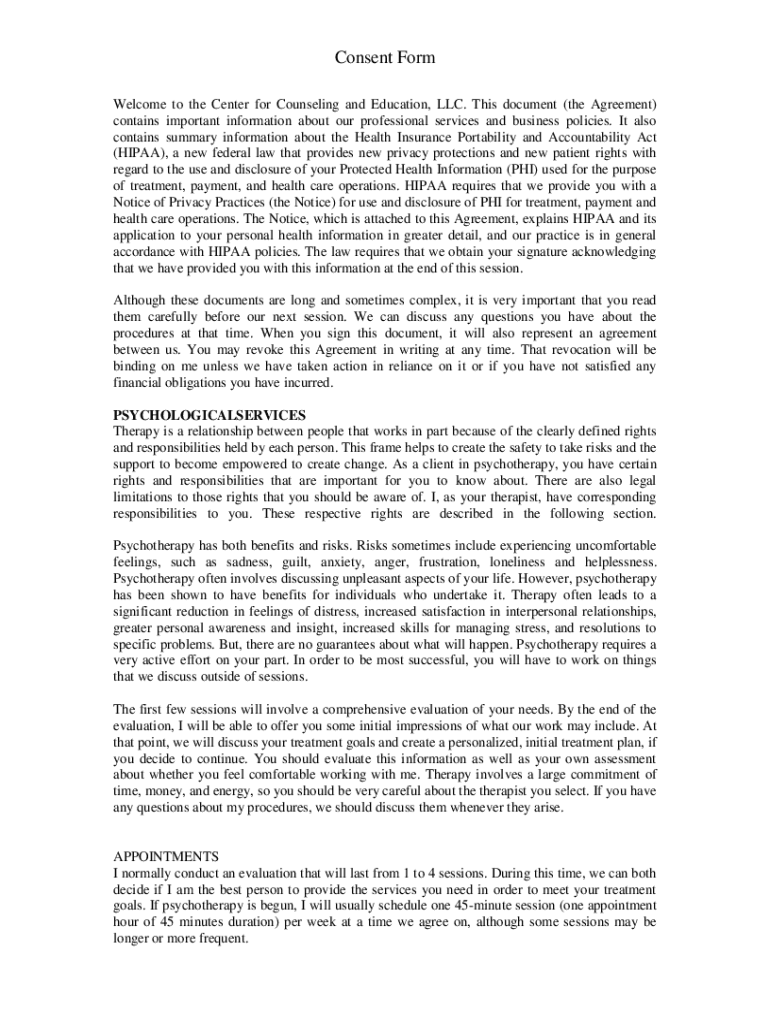 Consent Form Welcome to the Center for Counseling and Education, LLC. This document (the Agreement) contains important information about our professional services and business policies. It also contains
