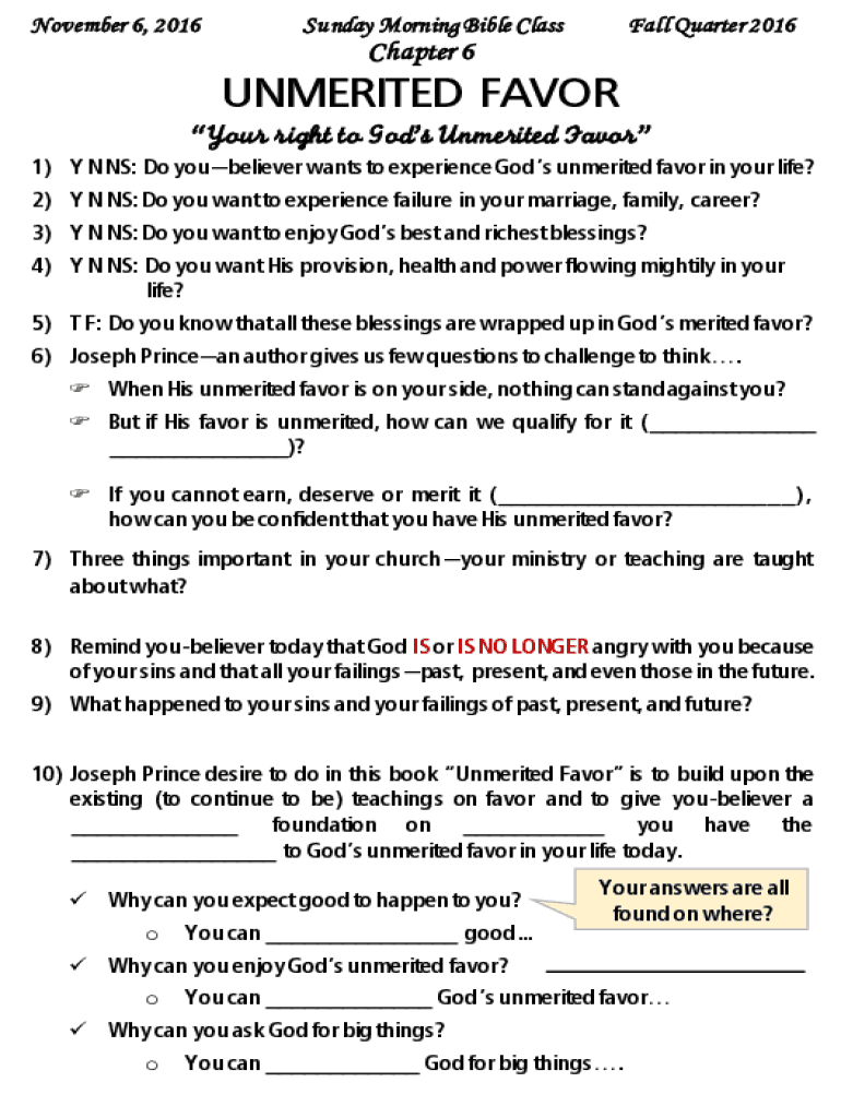 November 6, 2016Su day Morning Bible Classical Quarter 2016Chapter 6UNMERITED FAVOR Your right to Gods Unmerited Favor 1) Y N NS: Do you believer wants to experience Gods unmerited favor in your life?