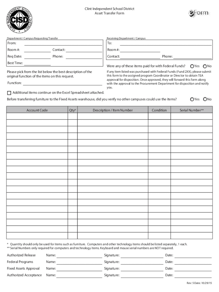 Asset Transfer FormDepartment / Campus Requesting TransferReceiving Department / CampusFrom:To:Room #:Contact:Room #:Req Date:Phone:Contact:Best Time:Phone: