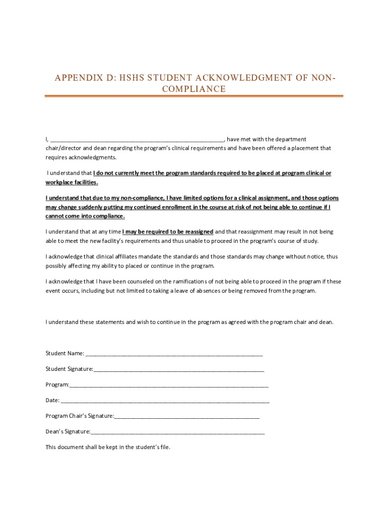 APPENDIX D: HHS STUDENT ACKNOWLEDGMENT OF NONCOMPLIANCE, ___, have met with the department chair/director and dean regarding the programs clinical requirements and have been offered a placement that