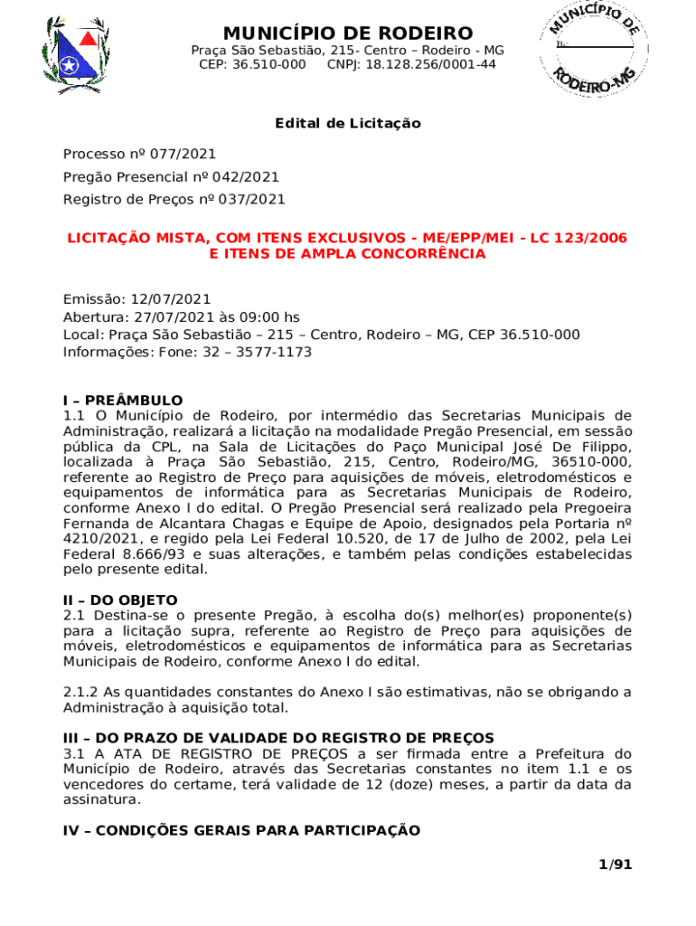 The 9415568 - Licitao: Edital e Anexos is a Word document which can be filled-out and signed for specified needs. Next, it is provided to the exact addressee to provide specific details and data. The completion and signing is available manually in hard copy or via a trusted tool like PDFfiller. These services help to fill out any PDF or Word file online. While doing that, you can edit its appearance for your requirements and put a legal electronic signature. Once you're good, you send the 9415568 - Licitao: Edital e Anexos to the respective recipient or several of them by mail and even fax. PDFfiller has got a feature and options that make your Word form printable. It provides various options for printing out appearance. It does no matter how you'll deliver a form - physically or electronically - it will always look well-designed and organized. To not to create a new file from the beginning over and over, turn the original form as a template. After that, you will have a rewritable sample.