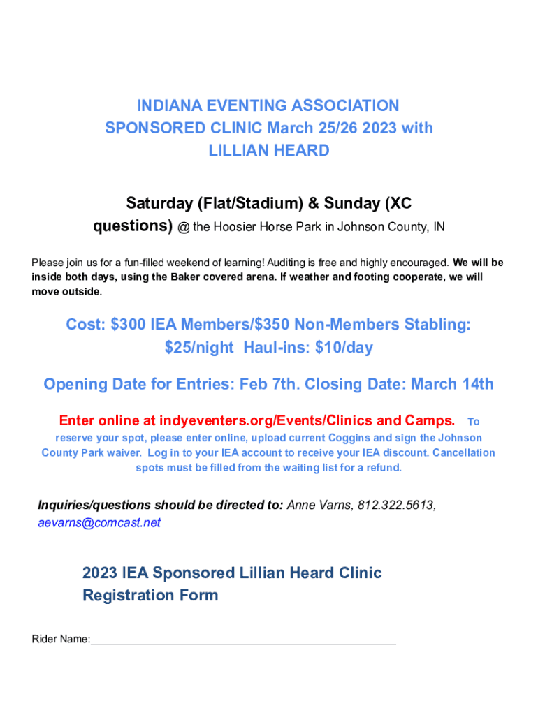 INDIANA EVENTING ASSOCIATION SPONSORED CLINIC March 25/26 2023 with LILLIAN HEARD Saturday (Flat/Stadium) & Sunday (BC questions) @ the Hoosier Horse Park in Johnson County, IN Please join us for