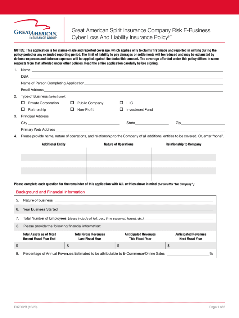 Get the free Great American Spirit Insurance Company Risk E-Business Cyber Loss and Liability Ins...