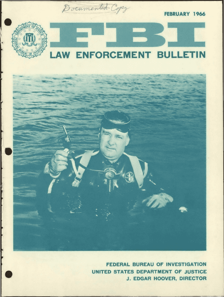 FEBRUARY 1966LAW ENFORCEMENT BULLETINFEDERAL BUREAU OF INVESTIGATION UNITED STATES DEPARTMENT OF JUSTICE J. EDGAR HOOVER, DIRECTORFEBRUARY 1966VOL. 35 NO.2THE COVER Diving for evidence. See \” Underwater