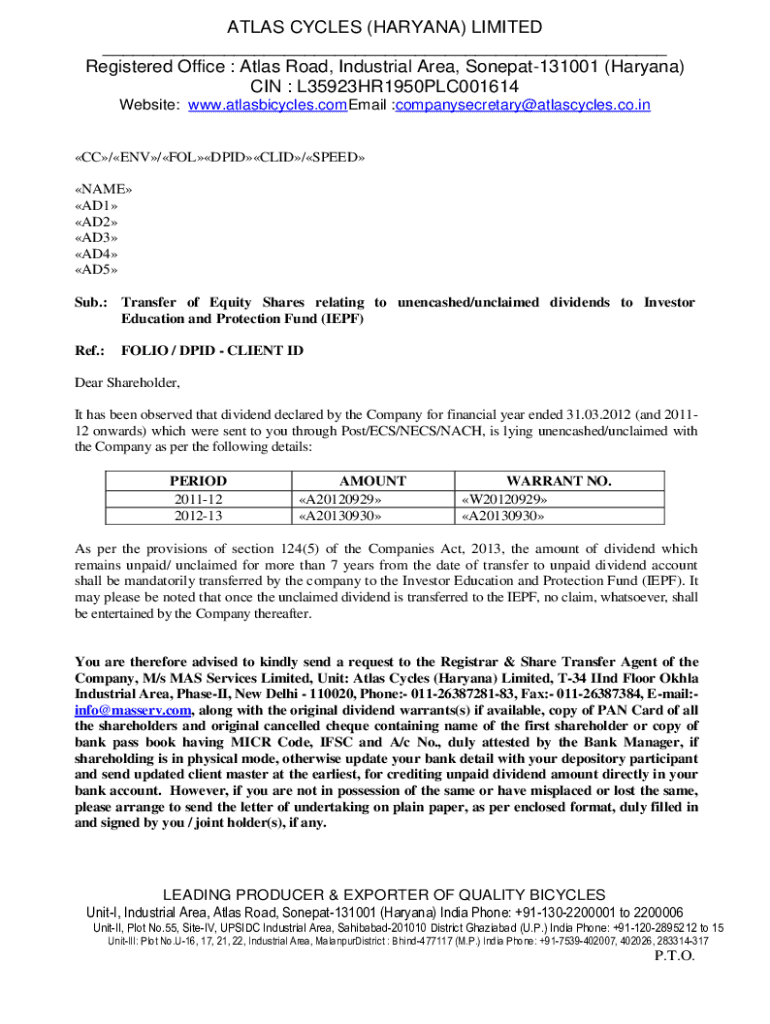 ATLAS CYCLES (HARYANA) LIMITED ___ Registered Office : Atlas Road, Industrial Area, Sonepat131001 (Haryana) IN : L35923HR1950PLC001614 Website: www.atlasbicycles.comEmail :companysecretary@atlascycles.co.inCC/ENV/FOLDPIDCLID/SPEED