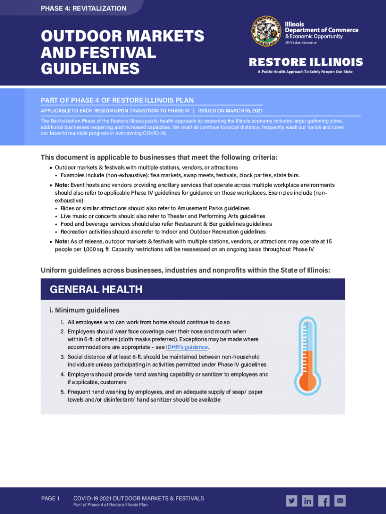 PHASE 4: REVITALIZATIONOUTDOOR MARKETS AND FESTIVAL GUIDELINESRESTORE ILLINOIS A Public Health Approach To Safely Reopen Our Statement OF PHASE 4 OF RESTORE ILLINOIS PLAN APPLICABLE TO EACH REGION