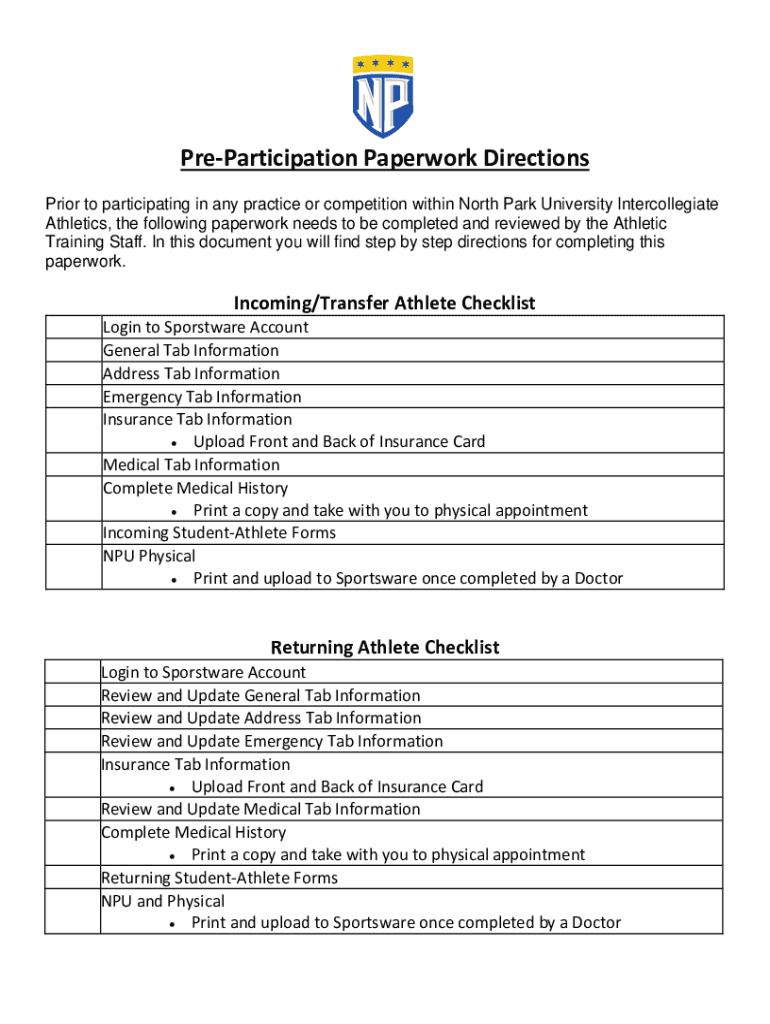 Participation Paperwork Directions Prior to participating in any practice or competition within North Park University Intercollegiate Athletics, the following paperwork needs to be completed and reviewed