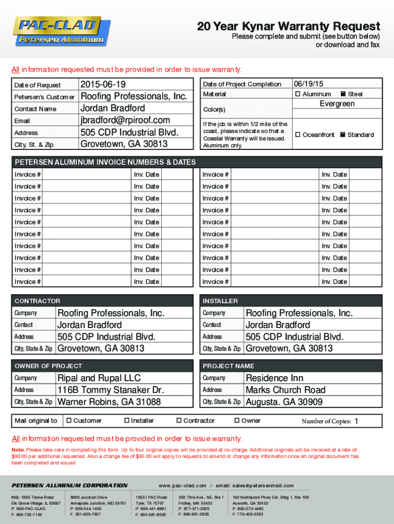 20 Year Warranty RequestPlease complete and submit (see button below) or download and fall information requested must be provided in order to issue warranty. Date of Request Petersen's Customer Contact