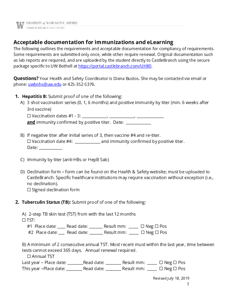 Acceptable documentation for immunizations and e-learning The following outlines the requirements and acceptable documentation for compliance of requirements. Some requirements are submitted only