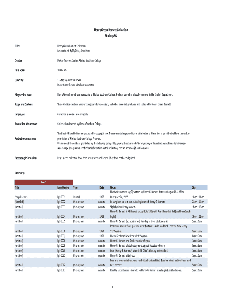 Get the free Henry Green Barnett Collection Finding Aid