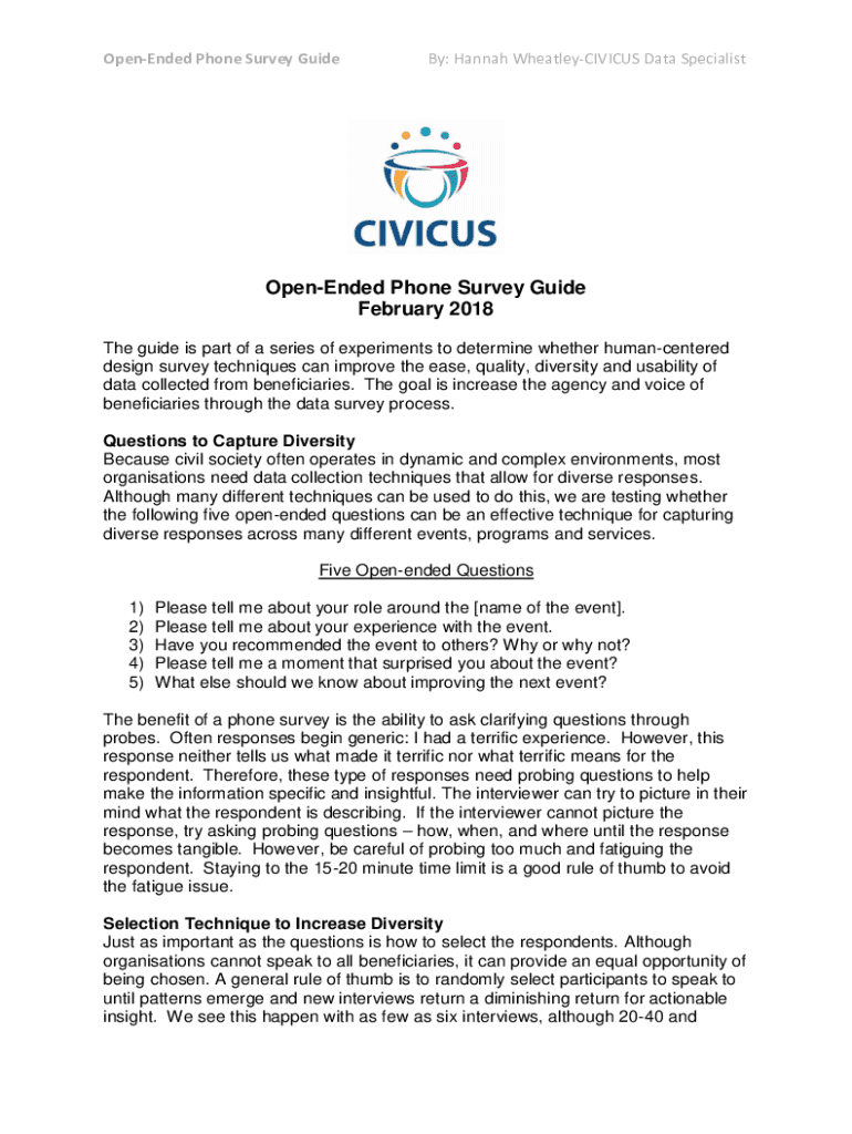 Open-ended Phone Survey Guide: Hannah WheatleyCIVICUS Data SpecialistOpenEnded Phone Survey Guide