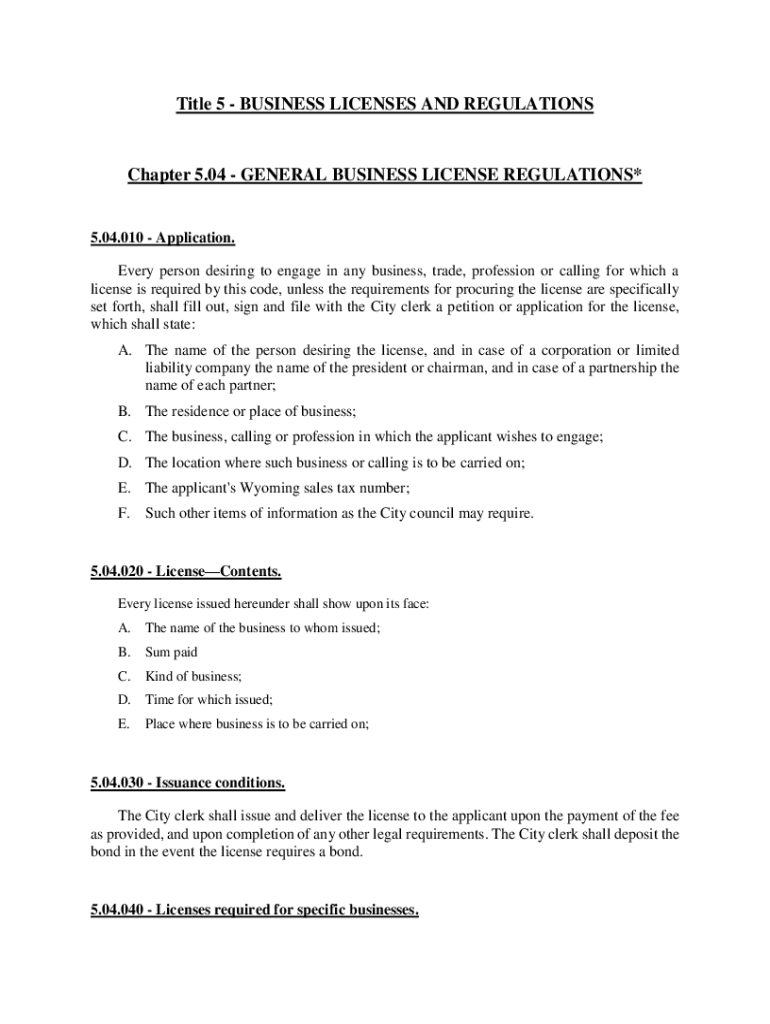 Title 5 BUSINESS LICENSES AND REGULATIONSChapter 5.04 GENERAL BUSINESS LICENSE REGULATIONS×5.04.010 Application. Every person desiring to engage in any business, trade, profession or calling for
