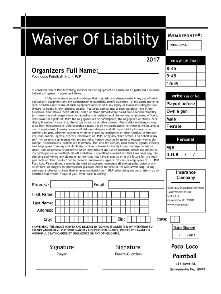 POLO LOCO PAINTBALL INC. Waiver Of LiabilityMEMBERSHIP# : 200202142017Organizers Full Name:___ Polo Loco Paintball Inc. PEEPSHOW Uptime:8:45 9:45 10:45In consideration of PLP furnishing services and/or