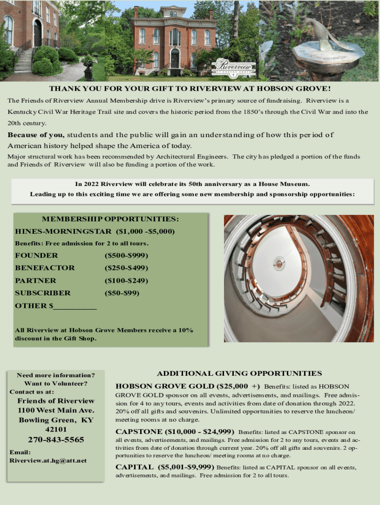 THANK YOU FOR YOUR GIFT TO RIVERVIEW AT HOBSON GROVE! The Friends of Riverview Annual Membership drive is River views primary source of fundraising. Riverview is a Kentucky Civil War Heritage Trail