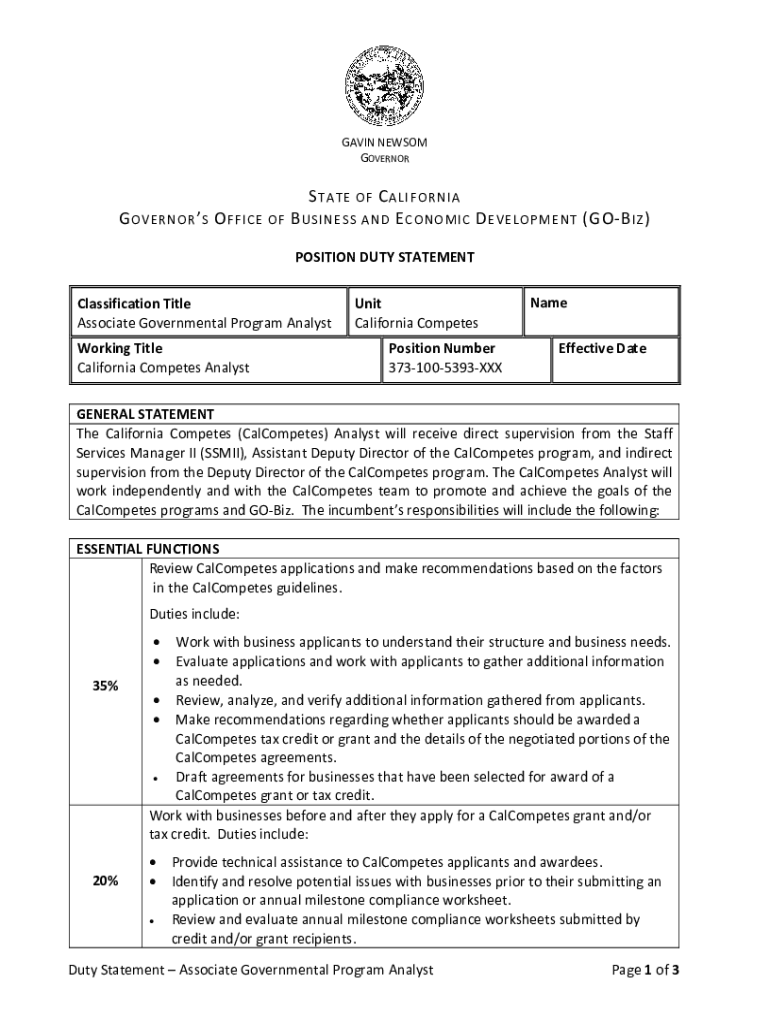 AND E ECONOMIC D DEVELOPMENT (GOB IZ)OF USINESSPOSITION DUTY STATEMENT