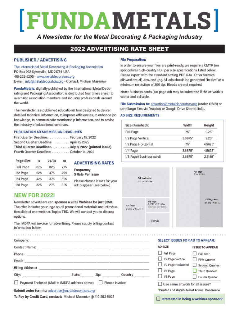 A Newsletter for the Metal Decorating & Packaging Industry 2022 ADVERTISING RATE SHEET PUBLISHER / ADVERTISINGFile Preparation:The International Metal Decorating & Packaging Association PO Box 992
