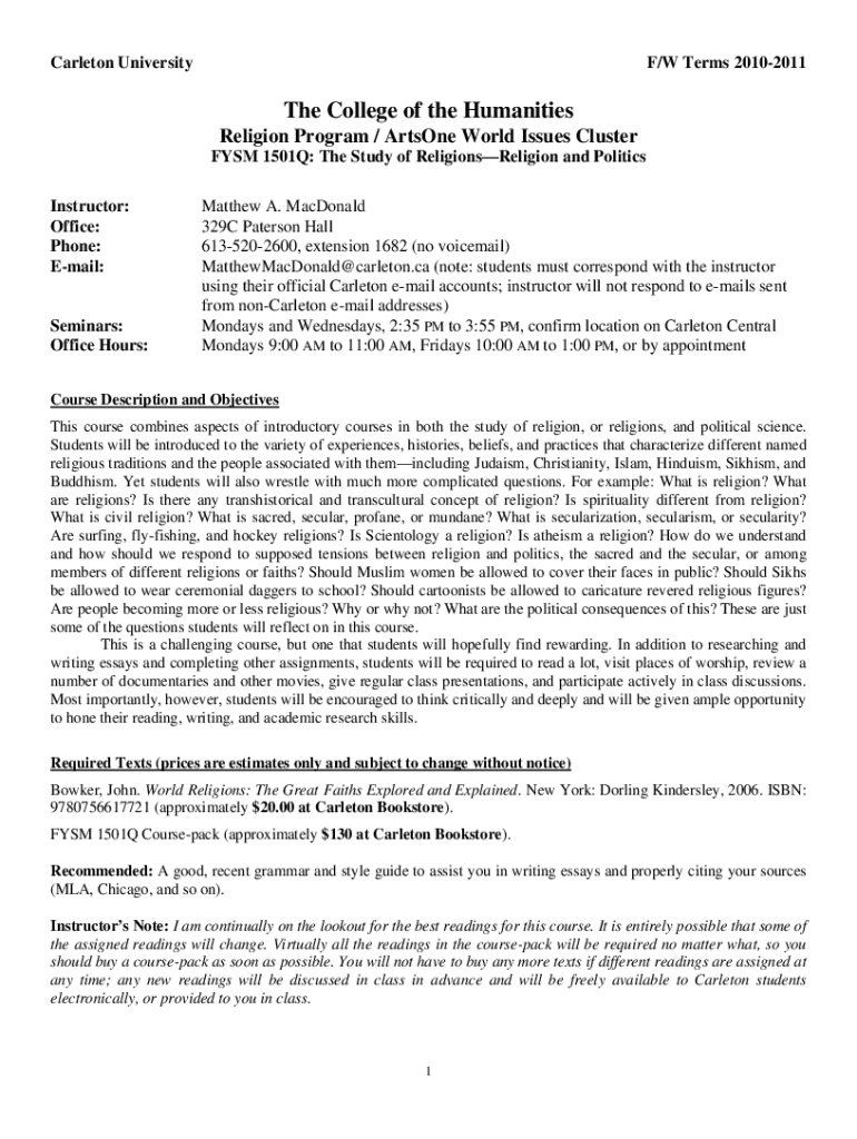 Carleton University/W Terms 20102011The College of the Humanities Religion Program / Arson World Issues Cluster FSM 1501Q: The Study of ReligionsReligion and Politics Instructor: Office: Phone: Email:Seminars: