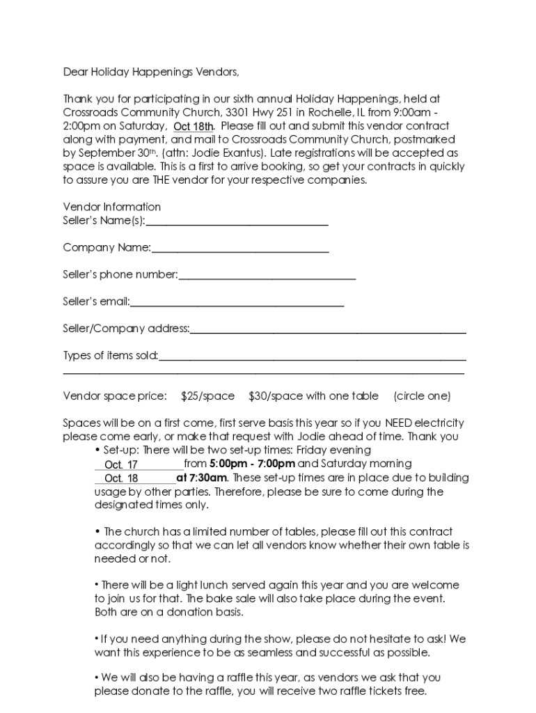 Dear Holiday Happenings Vendors, Thank you for participating in our sixth annual Holiday Happenings, held at Crossroads Community Church, 3301 Hwy 251 in Rochelle, IL from 9:00am 2:00pm on Saturday,