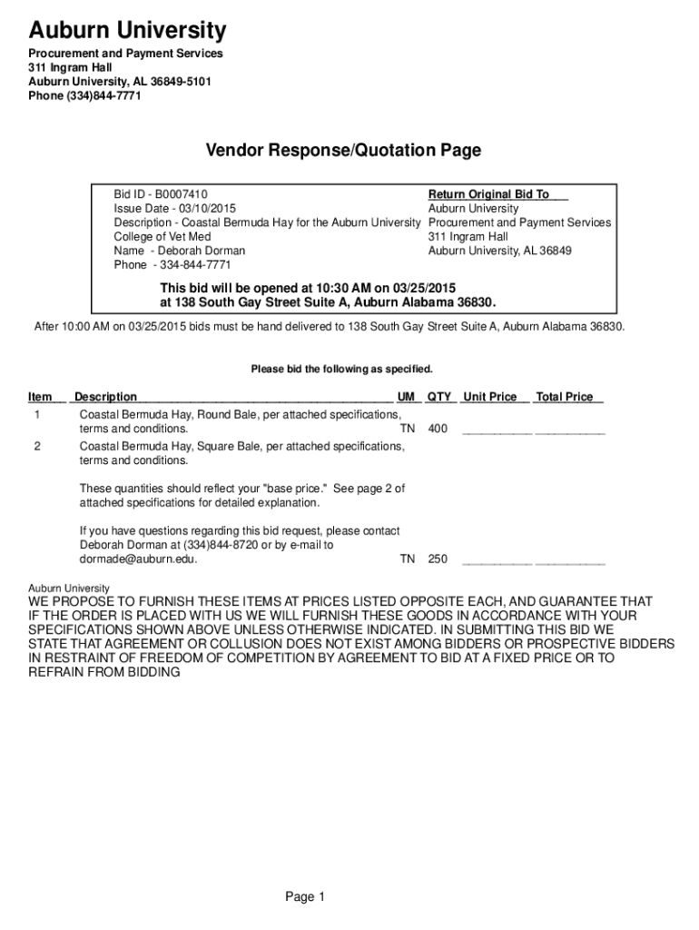 Auburn University Procurement and Payment Services 311 Ingram Hall Auburn University, AL 368495101 Phone (334)8447771Vendor Response/Quotation Page Bid ID B0007410 Issue Date 03/10/2015 Description
