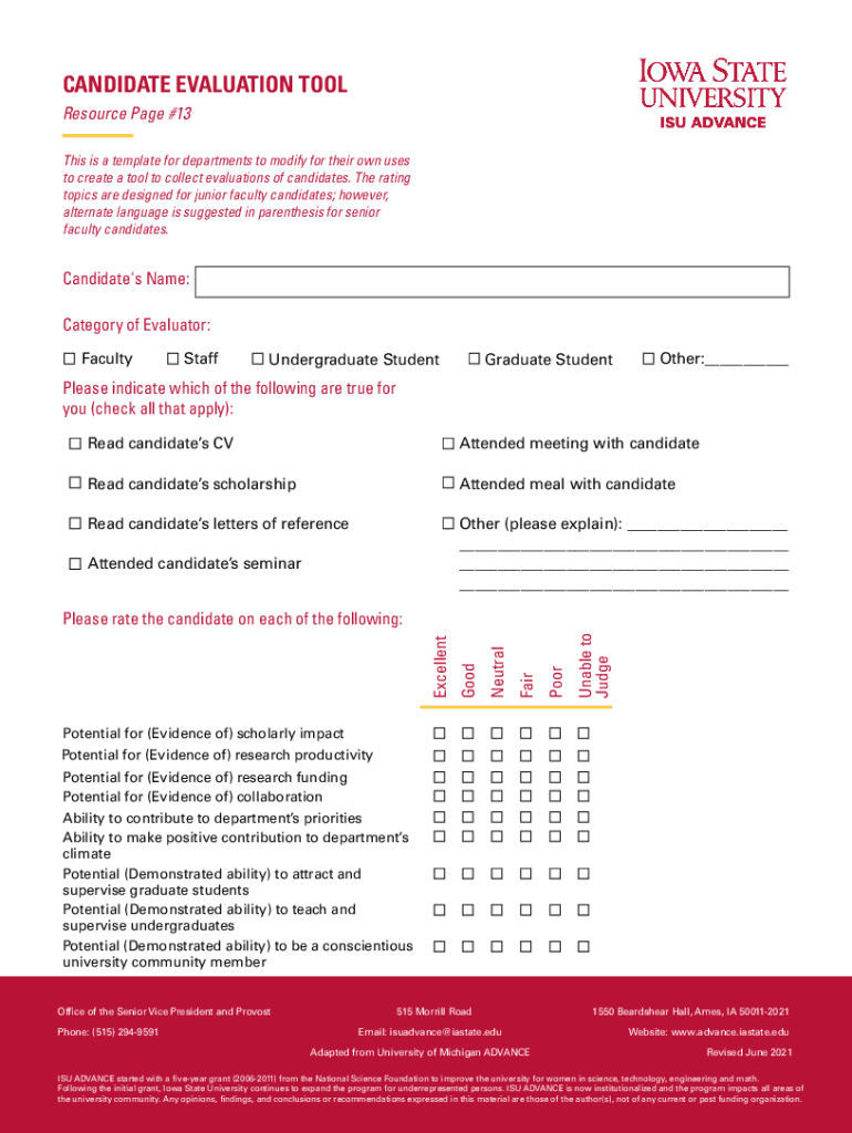 CANDIDATE EVALUATION TOOL Resource Page #13 This is a template for departments to modify for their own uses to create a tool to collect evaluations of candidates. The rating topics are designed for