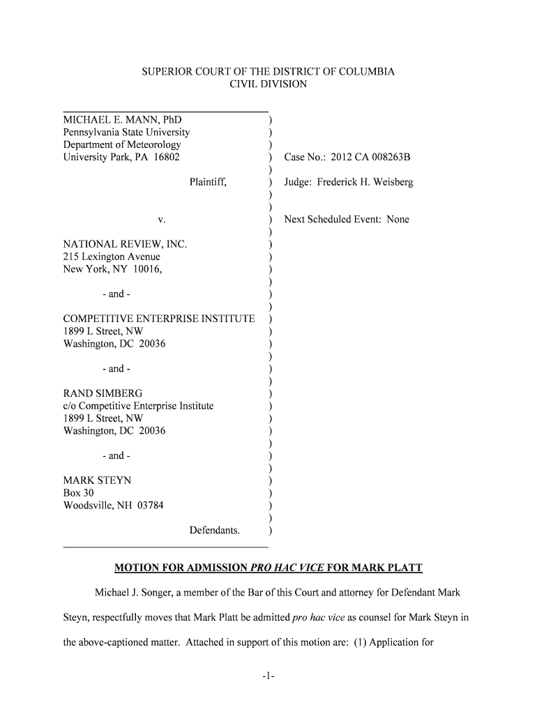 SUPERIOR COURT OF THE DISTRICT OF COLUMBIA CIVIL DIVISION MICHAEL E. MANN, PhD Pennsylvania State University Department of Meteorology University Park, PA 16802 Plaintiff, v. NATIONAL REVIEW, INC.