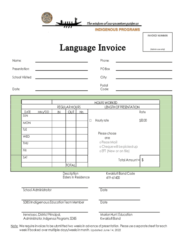 INVOICE NUMBERLanguage Invoice Name:Phone:Presentation:PO School Visited:City:Date:Postal Code:DATE SU NMM/HOURS WORKED LENGTH OF PRESENTATION RateREGULAR HOURS IN OUT Hrs. MON(Admin use only)Hourly