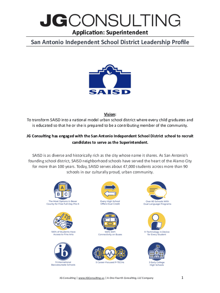 Applied on: Superintendent San Antonio Independent School District Leadership Pro revision: To transform SAID into a Na oral model urban school district where every child graduates and is educated