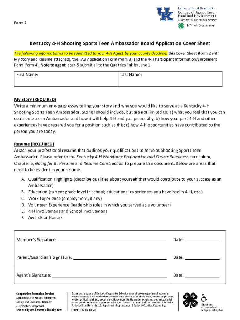 TO:Kentucky 4H Shooting Sports Teen Ambassador Board ApplicantsFROM:Ashley Marcus, Extension Specialist for KY 4H Shooting Sports RE:Kentucky 4H Shooting Sports Teen Ambassador Board Applications