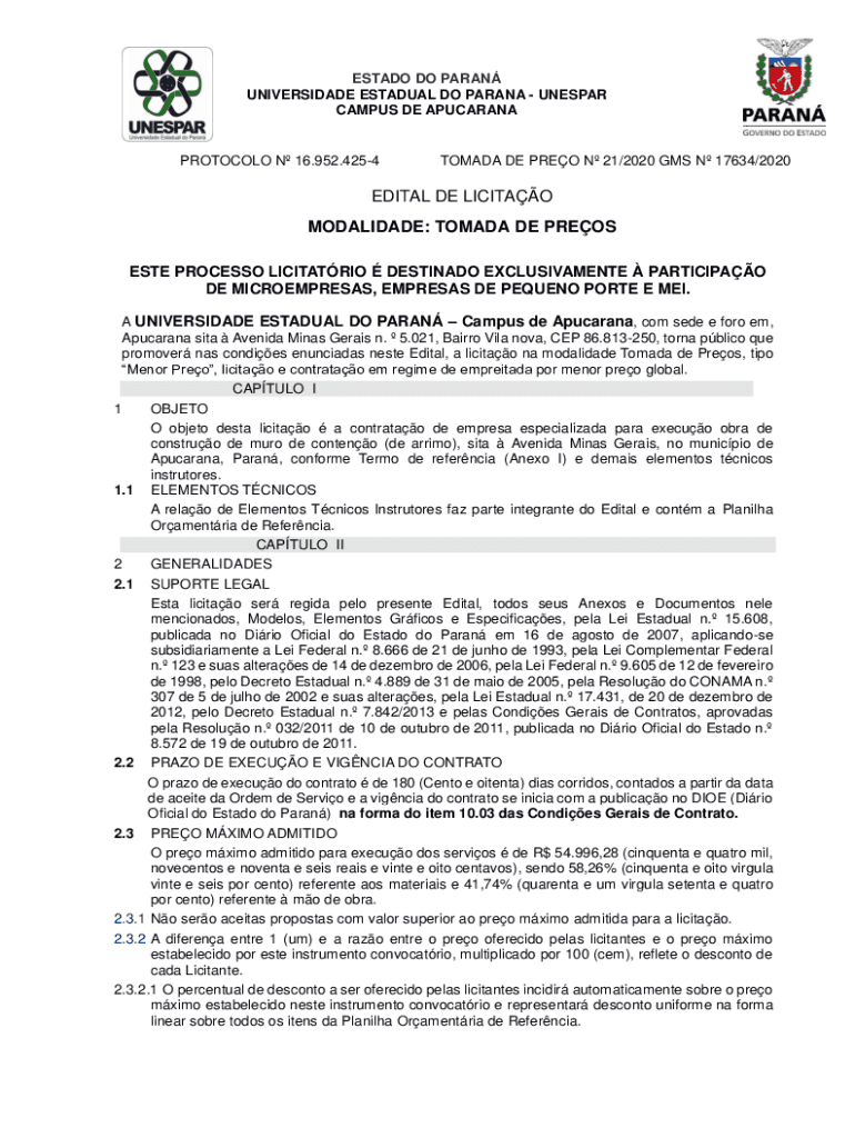 CAMPUS DE APUCARANAPROTOCOLO N 16.952.4254TOMADA DE PRO N 21/2020 GMS N 17634/2020EDITAL DE LICIT AO