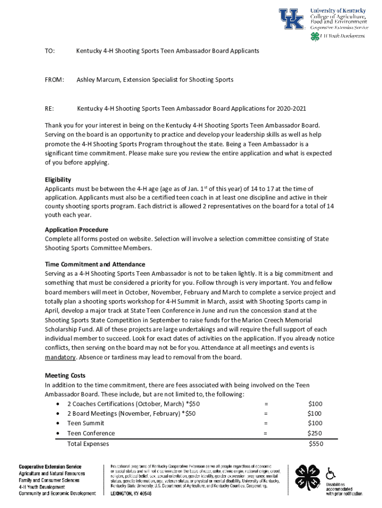 TO:Kentucky 4H Shooting Sports Teen Ambassador Board ApplicantsFROM:Ashley Marcus, Extension Specialist for Shooting Sports RE:Kentucky 4H Shooting Sports Teen Ambassador Board Applications for 20202021Thank