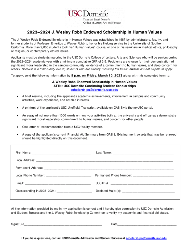 20232024 J. Wesley Rob Endowed Scholarship in Human Values The J. Wesley Rob Endowed Scholarship in Human Values was established in 1987 by administrators, faculty, and former students of Professor