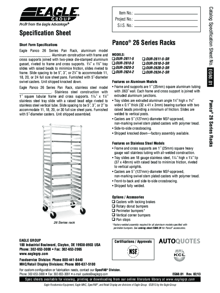 Specification Sheet Short Form Specifications Eagle Pasco 26 Series Pan Rack, aluminum model ___. Aluminum construction with frame and cross supports joined with two pieces die stamped aluminum gusset,
