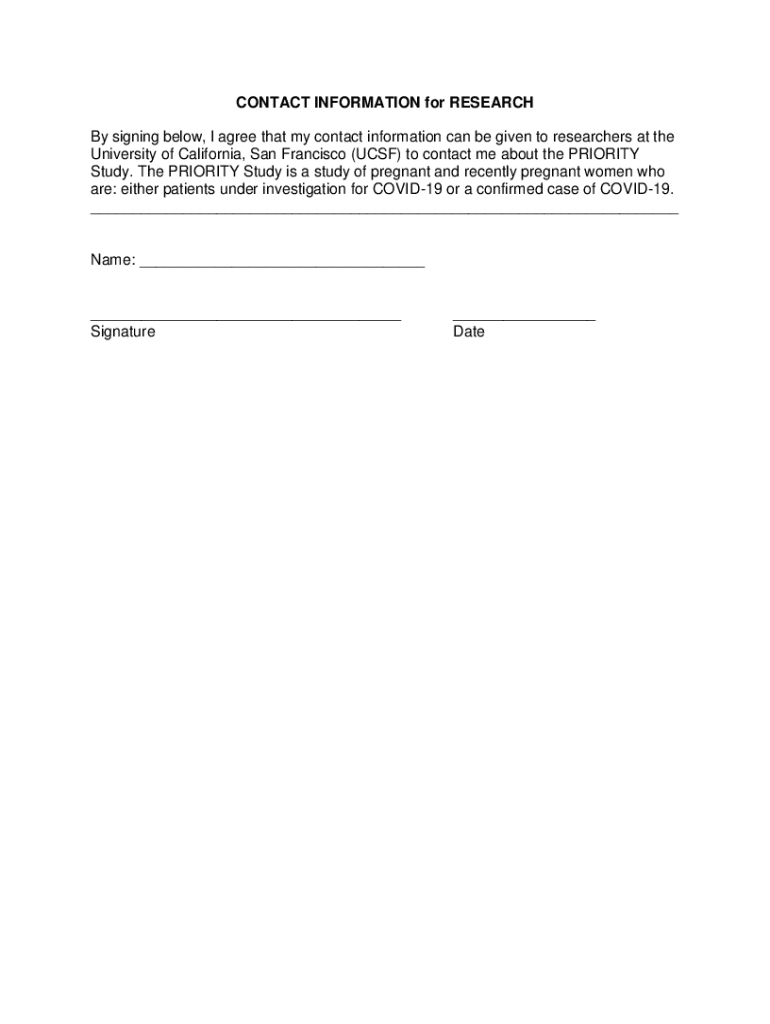 CONTACT INFORMATION for RESEARCH By signing below, I agree that my contact information can be given to researchers at the University of California, San Francisco (UCSF) to contact me about the PRIORITY